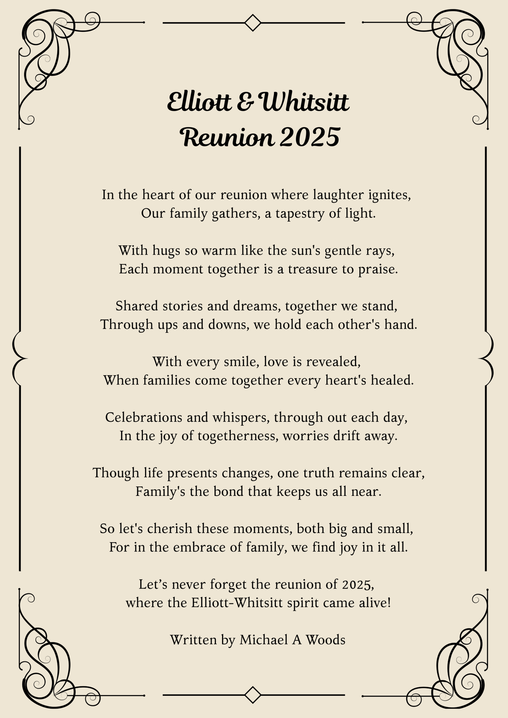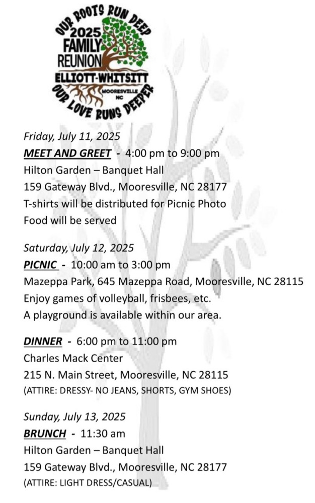On July 11–13, 2025, after a 20-year hiatus, the Elliott-Whitsitt family gathered in Mooresville, NC, for a joyful and successful reunion. It was a weekend filled with love, laughter, and the rekindling of family bonds.
